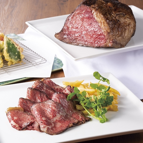 低温調理で仕上げたローストビーフは、ランチタイムの一番人気メニュー。ソースは、シャリアピンソース・おろしポン酢・わさび・岩塩を用意。お好みのスタイルでお召し上がりください。