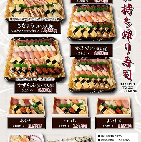 お得な持ち帰り寿司セットあります。お一人様用から大人数様まで!当店の味をご家庭でもお楽しみ下さい