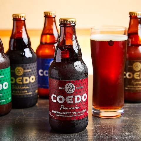 埼玉県川越を拠点としたコエドブルワリーが販売するプレミアムビールコエドビール。小江戸川越のサツマイモを使った紅赤など日本の色名を冠した6種類はどれも人気が高く当店でもよく出ます。設備の関係上一度にたくさんは入荷できないため、売り切れ御免!ぜひCOEDOで乾杯を♪