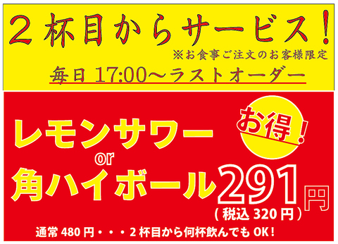 お食事ご注文のお客様限定、レモンサワーと角ハイボールが2杯目から割引き!
