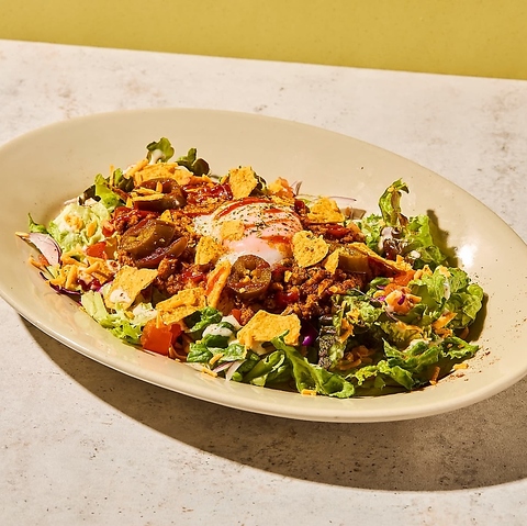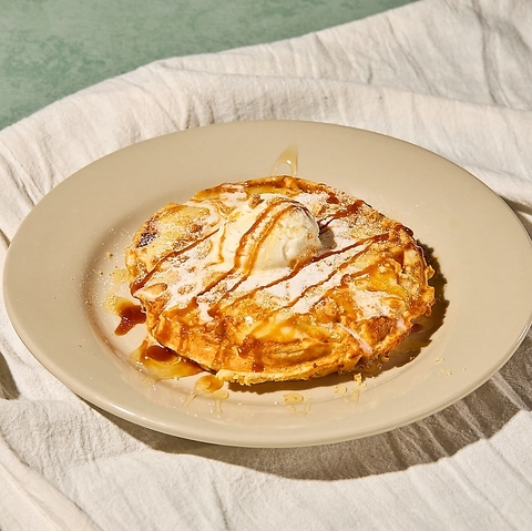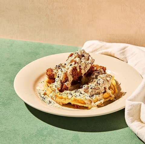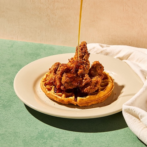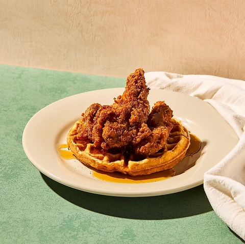外はカリッと中はジューシーなフライドチキンを、ふわふわに焼き上げたワッフルの上にのせた見た目も味もインパクト抜群の一品。メープルシロップの甘みが絶妙にマッチする看板メニューです!メープルシロップをたっぷりとかけてお召し上がりください♪