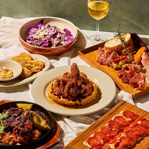 シェアして楽しいおすすめコース。前菜6種にペパロニピザ、本日のパスタに加えて、人気の「ワッフルチキン」も!デザートまでしっかり楽しめて、女子会や歓送迎会にぴったりです。