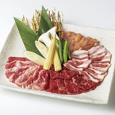 2~3人で丁度良い。七輪房の多彩な美味しさを吟味できる一皿をお楽しみください。【内容】黒毛和牛上赤身60g/牛ハラミ60g/上タン塩60g/焼き野菜