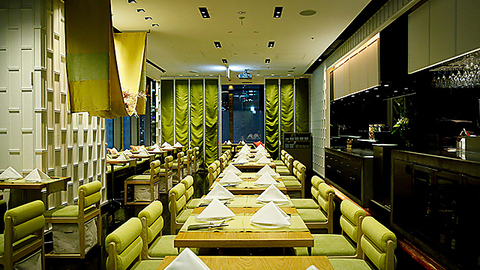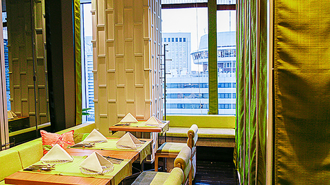 当店の席は、銀座の美しい景色を一望できるロケーションに位置しています。大きな窓から差し込む自然光と共に、緑を基調としたおしゃれなインテリアが心地よい空間を演出します。席からは、街の喧騒を感じながらもリラックスできる雰囲気の中で、タイ料理をお楽しみいただけます。