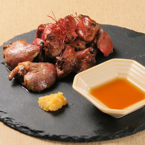 当店一番人気の鮮度抜群の朝引き鶏の白レバーです。炭火でふっくらレアに焼き上げています。おろしにんにく、ごま油につけてお召し上がりください!