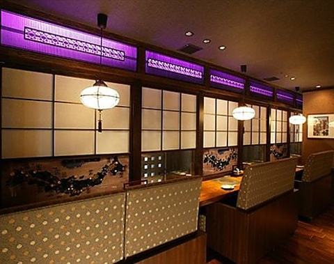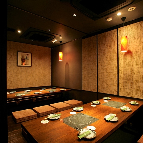 間接照明が中心の店内は雰囲気たっぷり♪襖で間仕切りされた6名からの掘りごたつ式のお座敷個室からシックなソファー個室、落ち着きのあるテーブル個室など!
