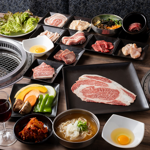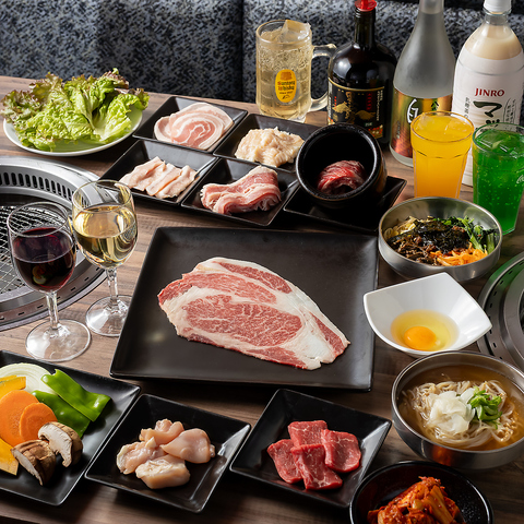 9月和牛・国産牛も登場!厳選焼肉を豪華に、お腹いっぱい楽しめる食べ放題コース。サーロインや壺漬け中落ちカルビやスペアリブ、など厚切り肉に加え石焼ビビンバ、冷麺、など、サイドメニューも充実、デザートも食べ放題で満足間違い無しの内容です!※小学生(7歳~12歳)は半額、幼児(6歳以下)は無料でご利用いただけます