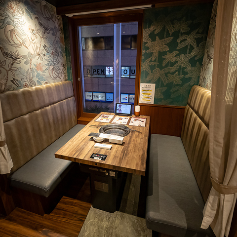 【少人数におすすめ】1~2名ピッタリのお席もございます!落ち着いた照明で雰囲気が良いので焼肉デートや焼肉女子会にもオススメです♪最新無煙ロースター完備でニオイもつきにくい!