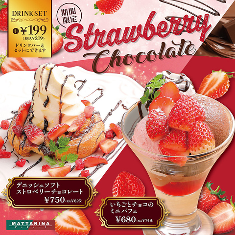 ☆デニッシュソフトストロベリーチョコレート825円◎シナモン香るデニッシュにいちごとたっぷりバニラソフト。仕上げにチョコソースをかけた至福のスイーツ☆いちごとチョコのミニパフェ748円◎いちごの爽やかさとチョコの濃厚さを一度に味わえる贅沢パフェ。【+\219でドリンクバーとセットにできます!】