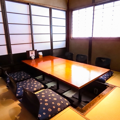 【ゆったりくつろげる掘りごたつ】足を伸ばして座れる掘りごたつ席は、長時間の食事でも疲れにくく、ご年配の方にも好評。囲んで座れる安心感があり、三世代の団らんやお祝いごとなど、ゆっくりと語らいたい場面にぴったりの人気席です。