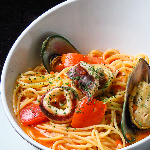 魚介の旨みがしっかり出た濃厚トマトソース。ライブレストランとは思えない本格派パスタで、「食事目当てで来るお客様」も多い一品。