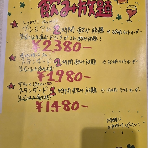 飲み放題スタンダード1980円 プレミアム2380円 2時間飲み放題(ラストオーダー30分前) スタンダード1480円1時間飲み放題(ラストオーダー15分前)ご宴会もプラス300円でプレミアムに変更可