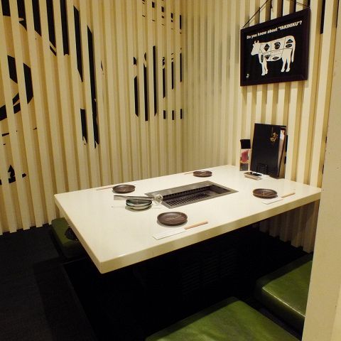 4名席、6名席がございます。禁煙席となります。友人や恋人、家族と一緒にお食事を楽しんでいただけます。白を基調とした落ち着いた空間の中、ゆっくりお寛ぎくださいませ。当店自慢の焼肉と共に、贅沢なひと時をお過ごしください。