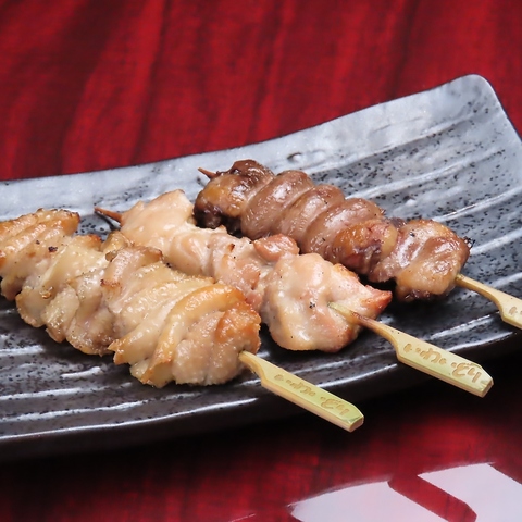 【炭火で焼き上げるこだわりの炭火焼鳥】炭火でじっくりと丁寧に焼き上げた、旨みたっぷりの炭火焼鳥はいかがですか?定番のハツや皮、砂肝から、ボンジリ、せせりなど。炭火で焼けば香ばしい香りが広がり、外はカリッと中はジューシー♪鶏本来の甘みと深いコクが口いっぱいに広がる、贅沢な一皿です。是非ご賞味ください!