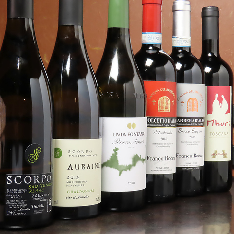 スタッフが厳選した希少なワインをお楽しみいただけます。オーストラリア産の白ワイン「スコルポ」はソーヴィニヨンブランとシャルドネをご用意。赤ワインはアメリカ産「カレラ・セレック2004ピノノワール」をご用意しております。上質なワインの香りと味わいをお洒落な雰囲気の店内で、こだわりの創作料理とお楽しみください。