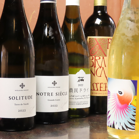 当店では日本ワインを取り揃えております。栃木の風土が感じられる小粋な白ワイン「農民ドライ2017」やワインの名産地山梨産の白ワイン「アルガブランカ・イセハラ2014」もリストアップ。北海道(平川ワイナリー)産赤ワイン「ソリチュード余市」も味わえます。※時期によって入荷するワインは変わります。詳しくはお店へお問い合わせください。