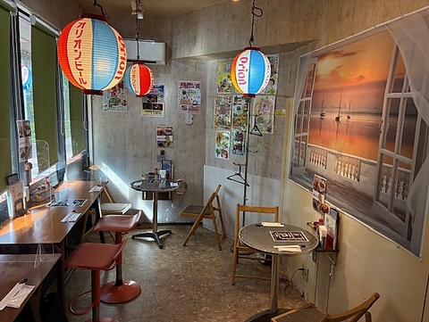 2階席にはモニターが!映像も音楽も沖縄色満載。注目スポーツ観戦があるときはお客様の要望に応えています。落ち着いた雰囲気なので食事をゆっくり楽しみたいなんて方にも喜ばれます。