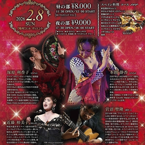 2/8限定『バレンタイン フラメンコライブ』を楽しめるコースもございます。特別なひと時をお楽しみください