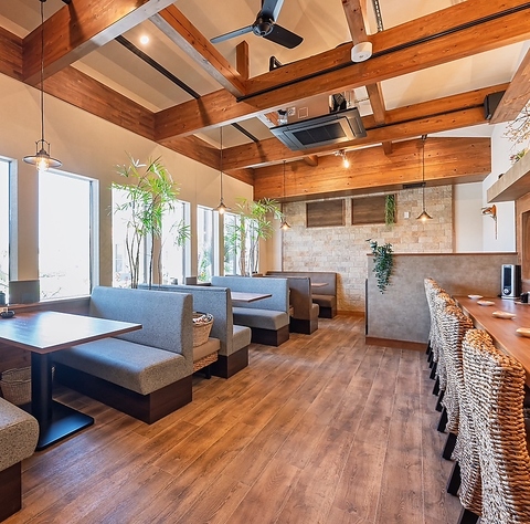 高い天井に木の梁が映える広々とした店内。枝やランタンの装飾が、心地よいひとときを演出します。