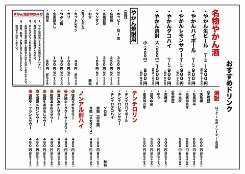 ドリンクメニューは種類豊富にご用意!チンチロリンや名物やかん酒など、お好きなお酒をお楽しみください◎