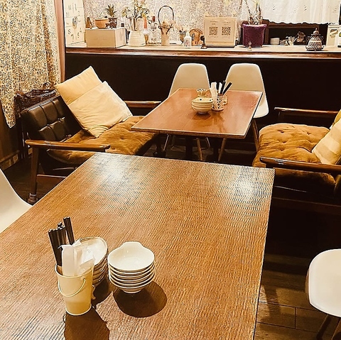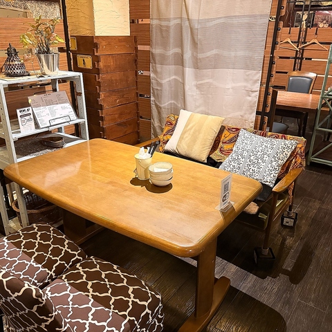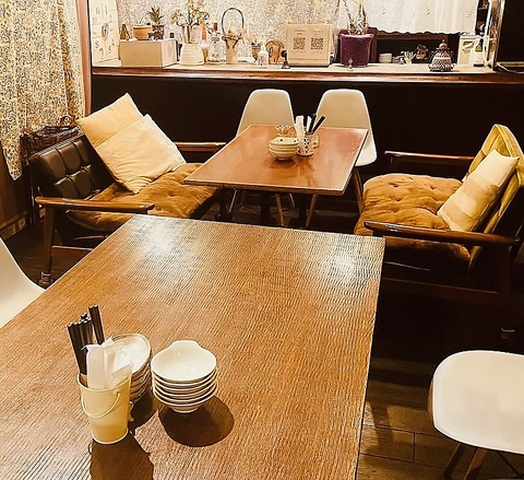ゆったり広めの店内にソファー席、お座敷、テーブル席、個室などいろんなシチュエーションでご利用くださいませませ