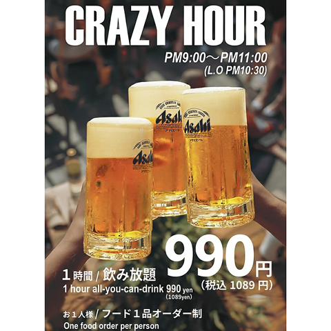 21時から1時間990円(税込1,089円)の飲み放題をご用意しております。お一人様フード1品以上のオーダーをお願いいたします。ラストオーダーは10時30分ですので二軒目やお仕事帰りなど遅い時間からお得に楽しみたいお客様におすすめです!