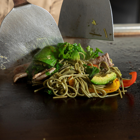 アボカドを具材に使用し、ソースにはトロロやほうれん草のピューレなど、たっぷりの野菜のすりおろしを加え仕上げ、麺には何と「日本そば」を使って今までの概念を覆す焼きそばに仕上げました。お味は醤油ベースで、日本そばともマッチします♪