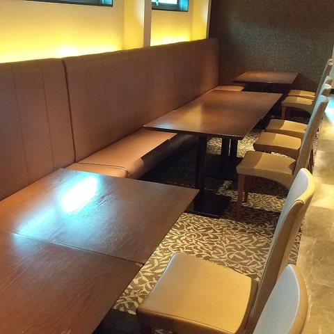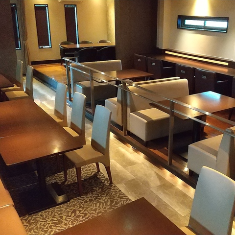 黒のソファーがブラウンやベージュの色調を引き締める。少し贅沢な感じがする店の雰囲気。