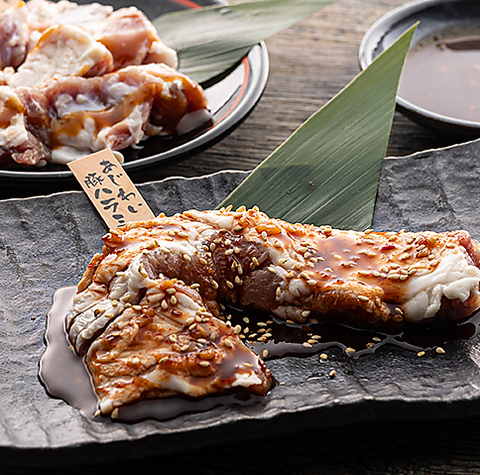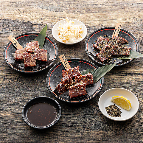 定番の醤油ダレ・味噌ダレの他にも、「鬼おろしポン酢」「やみつきとろ玉ダレ」「ネギ塩ダレ」「青唐醤ダレ」4種の特製ダレをご用意!それぞれの部位をさらに引き立てる食べ方をご提案しています。中でも鬼おろしポン酢はニンニクスライスのパンチが効いていて1度食べたらクセになる人続出!!