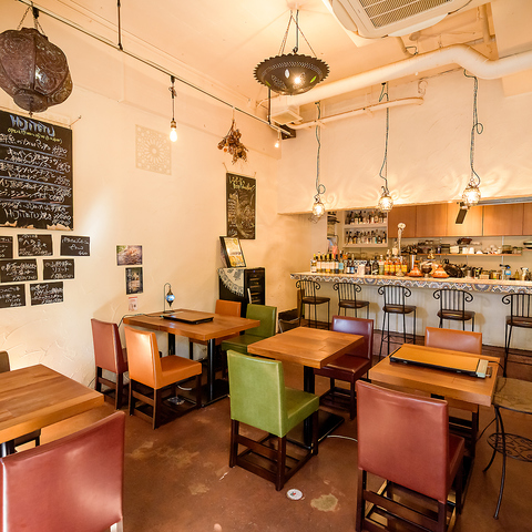 モロッコタイルのカウンターやこだわりのインテリアが飾られる店内は、ゆったりとくつろげる、まさに大人の隠れ家♪リゾート感溢れる店内、オープンテラスもあり開放的。異国情緒な時間を楽しんで下さい。