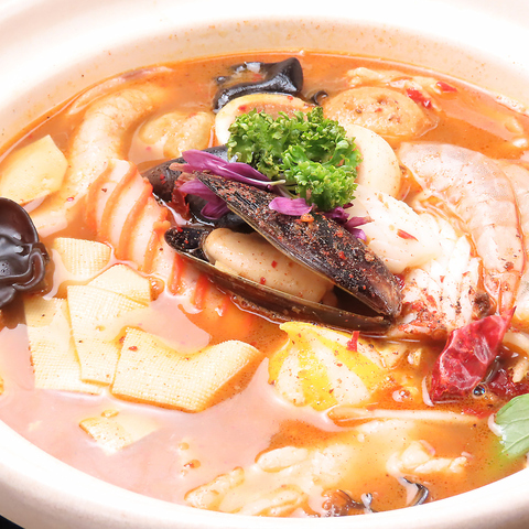 ピリッとした辛さと深い旨みが特徴のスープです。たっぷりの具材とともにお召し上がりください。2人前は2750円とお得!