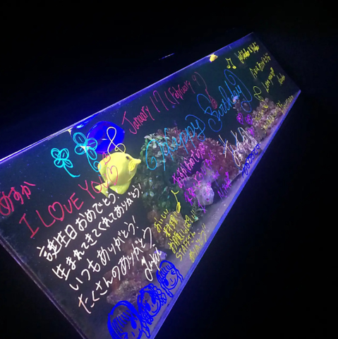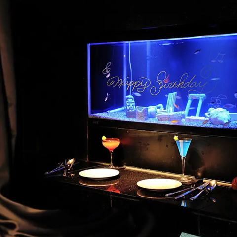 お席には熱帯魚が泳ぐ水槽がございますのでお好きなメッセージを書き込むことが可能です。誕生日・記念日・歓迎会・送別会などご利用シーンに応じてメッセージをお入れできます!熱帯魚を眺めながら大切な時間をお過ごしください☆