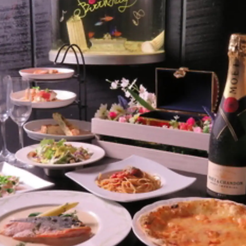 自慢の創作イタリアンでデートを素敵においしく演出♪全席にある水槽にメッセージを入れるサプライズで思い出に残る一日に♪新感覚!!女子の大好きなパンケーキをワッフルで作っちゃいました☆女子会コースは3388円(税込)、記念日コースは多彩なプランをご用意しております◎