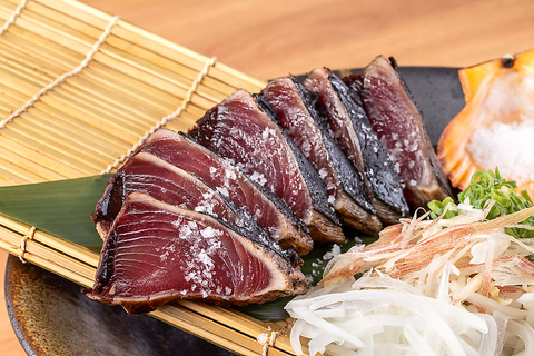 高知の名物料理の藁焼き★巨大な藁の炎でムラなく焼き上げ、表面を焼き上げることにより旨みを閉じ込めるとともに、いぶされることにより燻されたような香りが漂う絶品メニュー!!