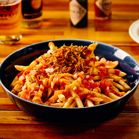 カルニータス、サルサ、チーズ、ケチャップを乗せたとてもジャンクなポテトです。