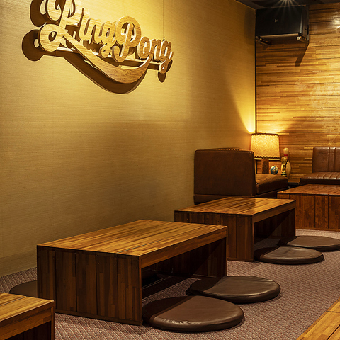 シンボルの卓球台が目を引くメインフロア。靴を脱いで入店していただくのが中目スタイルです。不思議と心と身体も開放されて自然体で楽しめます。初めての方も是非一度ご来店ください。