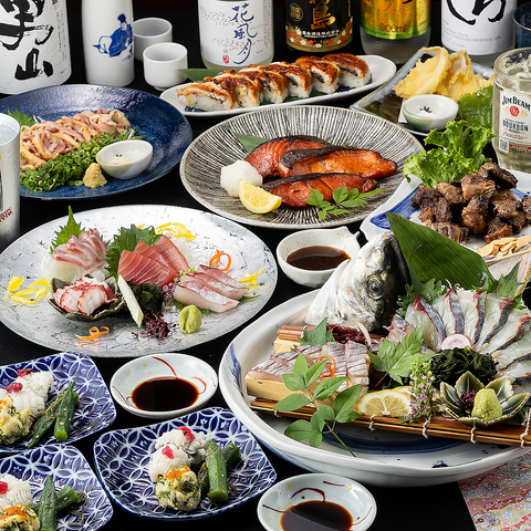 活〆旬魚造りや厳選刺身、ふぐ唐揚げや牛タン葱塩焼き、銀鱈みりん焼きや後料理ヤリイカ天ぷら、〆はお寿司