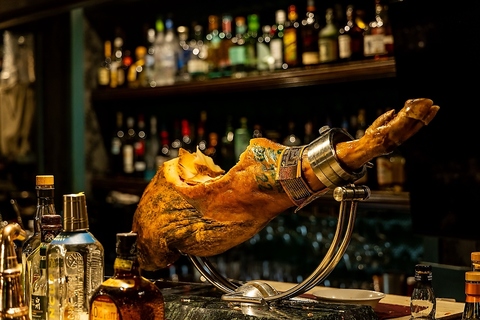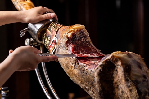 スペイン産の生ハムでもっとも知名度が高い銘柄の1つ!しっかりとした塩味が付いております!熟成期間が長くなるほど肉の風味が抑えられ、香り高い味わいを生み出します。熟成させたからこその旨味と風味が凝縮♪原木のまま目の前でスライス致します。切り立てを是非ご賞味ください!