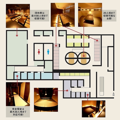 | 個室 | あり :全17部屋(4名/6名/8名/10名/12名/30名/60名) |