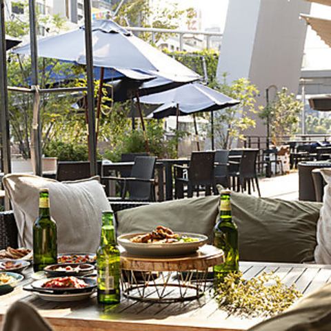 【堀江リバーサイドのテラス席】当店ではテラス席もご用意しております!テラスから眺められる景色や開放的な雰囲気でご利用いただけます♪ランチやカフェ帯でのご利用もオススメしております♪テラス席でご利用いただけるBBQプランもご用意しております♪