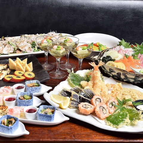 呉豆腐、旬魚のお刺身三種盛り、シルクスィート焼芋の葛饅頭、鱈のポワレ、鮟鱇の唐揚げといった全9品をお楽しみいただけます。さらに、神泡のプレミアムモルツ、山口の地酒 獺祭、雁木、山口県産夏みかんドリンクなど100種類以上のドリンクが2時間飲み放題!各種ご宴会はもちろん、お食事会などにも是非ご利用ください。