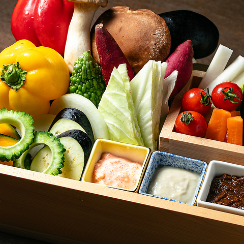 お通し代として500円(税込)で、季節の野菜盛り(焼き野菜&スティック野菜)をご提供!おかわり自由です◎ ※小学生以下は無料 ※コースご利用の方はお通し代不要です