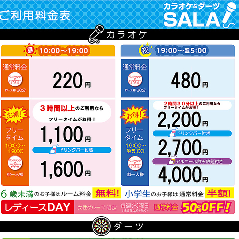 | その他設備 | カラオケ42ルーム、ダーツ8台、無料貸し出しのコミックもあります!! |
