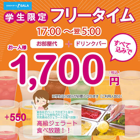 ドリンクバーも付いて最大12時間ご利用可能!!(※グループ全員の学生証提示が必要となります)