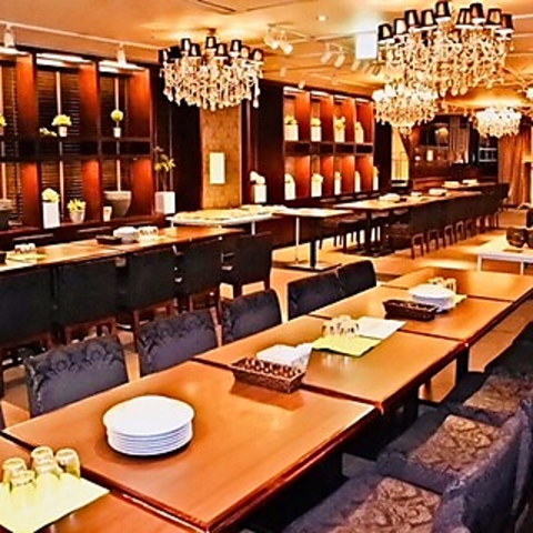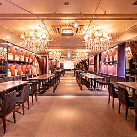 【北新地・西梅田から5分圏内と便利♪】大型宴会スペースあり!会社宴会・仲間との食事会を、いつもと違う雰囲気で。ラグジュアリーな装飾が印象的な個室♪20名様から120名様まで大小のお部屋を用意しております。柱や死角がなく、ひと目で全体を見渡せる広々空間。どの席からもスクリーンや余興が見やすく一体感も◎