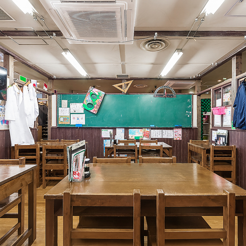 店内には、黒板にランドセル、校長室、職員室、プラネタリウム室、教室とあの懐かしい小学校そのものです♪個室2名様~24名様まで!どの教室になるかは来校してからのお楽しみ♪椅子に座って勉強机で給食を食べたら、もう小学校時代にタイムスリップした気分になれます!送別会に大人気です!!