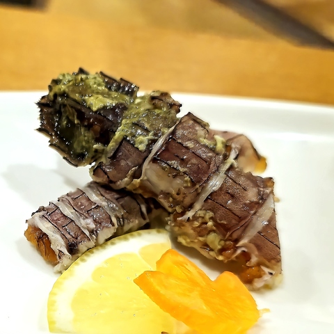 生け簀から取り出した新鮮な蝦夷アワビを使用した贅沢な貝焼き。ほどよく火を通すことで香ばしさが増し、やわらかな食感と濃厚な旨みを引き立てます。肝のコクも一緒に味わえる一品で、七輪で炙りながら熱々でお楽しみいただけます。(※厨房での調理も承ります)