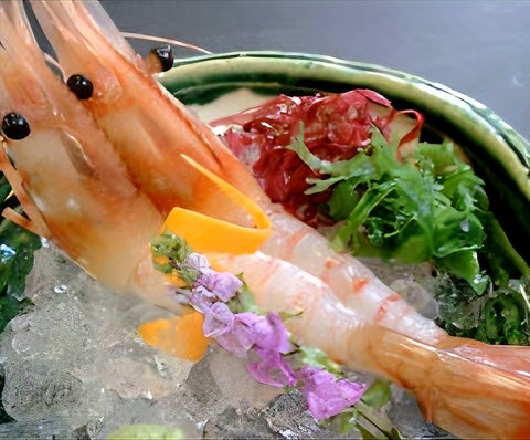 濃厚な甘みととろける食感が魅力の大ボタン海老刺身。肉厚でぷりっとした身は、噛むほどに海老本来の甘みと旨味が口いっぱいに広がります。一人前2尾でご提供する、海老好きに人気の贅沢な海鮮刺身です。