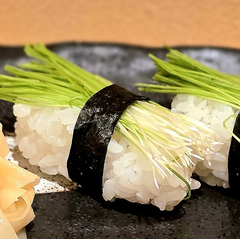 爽やかな香りとシャキッとした食感が特徴の芽ネギを、職人が丁寧に握るさっぱりとした一貫。口の中に広がる清涼感が心地よく、海鮮やお鮨を楽しんだ後の箸休めや〆のお鮨としてもおすすめです。さっぱりとした味わいをぜひご堪能ください。