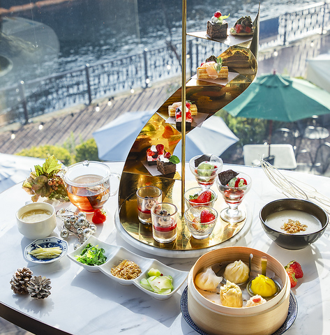 産直フルーツのアフタヌーンティー付ランチコース【楊貴妃】をbleuよりご提案致します♪点心5種食べ比べや中華粥などボリューム感をしっかり感じるお食事と、女性に嬉しい約20種類の中国茶をご用意♪お好きなだけお召し上がりいただけます